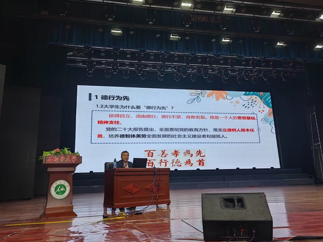 吕德生教授以“精准定位,笃定目标,扬帆起航”为题,以深入浅出、通俗易懂的话语、生动的案例传授了最深刻的道理。他与同学们分享了自己关于“角色定位、目标定位、价值定位”的方法、要素、重要意义的思考启发,教育引导学生在“我是谁”的角色定位中找到作为学生的本质,在“我来这里干什么”的思考中找到方向与目标,在“我将来能干什么”的追问中探寻实现人生价值的路径。他强调“大学生要德行为先,智慧为要,体质为基,要真正践行德智体美劳全面发展,将来成为新时代中国特色社会主义现代化建设者和接班人”。