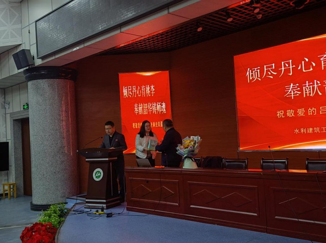 娄哲为全体学生简要介绍了吕德生老师躬耕杏坛四十载,倾尽丹心育桃李的个人事迹以及在人才培养、教育教学和学术科研领域取得的辉煌成果,当讲到吕德生老师要离开教师岗位光荣退休,本次讲座可能是吕老师最后一次为大家授课时,全体师生纷纷起立热烈鼓掌向吕老师致敬,并送出“吕老师,您辛苦了,祝您幸福安康”最真挚的祝福。学生党员代表和辅导员教师代表分别为吕德生老师赠送鲜花和专属定制纪念品表达崇高敬意和美好祝福。